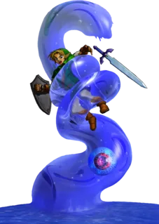 Ahora, sumérgete en el agua y atraviesa el espacio donde antes estaba el bloque. Sube por el otro lado. Te encontrarás en una pequeña habitación. Localiza el interruptor de cristal y golpéalo con la espada. Esto hará que se eleve una columna de agua. Salta rápidamente sobre la columna y luego cruza al otro lado de la habitación, ignorando la tectita por ahora, y cruza la puerta.